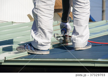 屋根のガルバリウム鋼板にネイルガンで釘を打つ作業