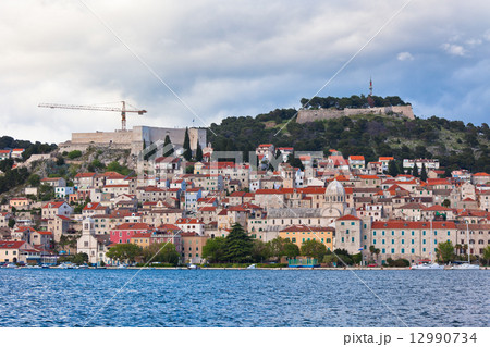Historic city centre of Sibenik, Croatia with St. Michael's Fortress. Adriatic Sea in the background
