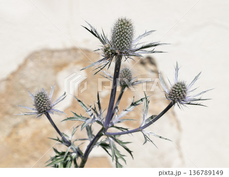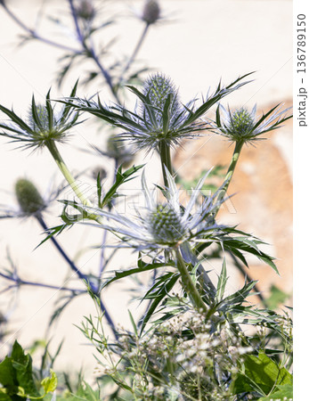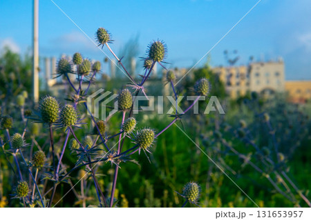Eryngium, also known as the eringo or sea holly, in city environment
