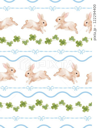 An enchanting Easter-themed pattern featuring whimsical bunnies, clover leaves, and playful wavy stripes. Delightful ribbon bows and waves add a special charm