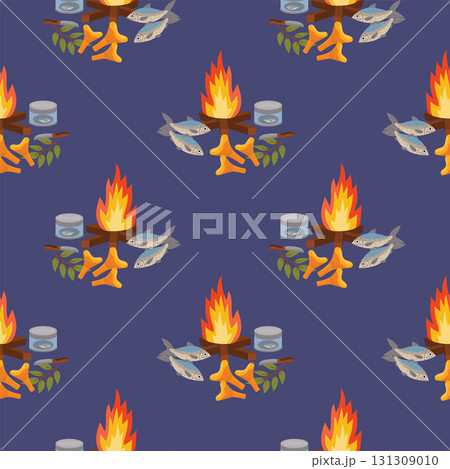 Seamless camping pattern with bonfire, fishes, canned fish, mushrooms and knife on dark blue background in polka dot order.