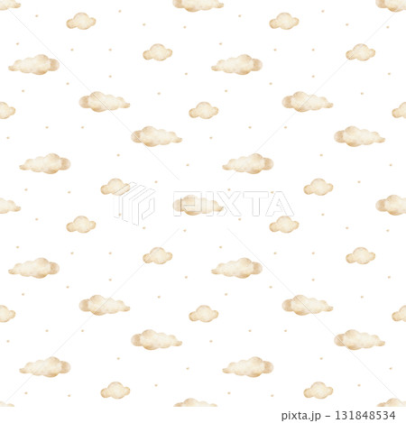 Children's pattern cute beige clouds among stars. Hand-drawn watercolor illustration in monochrome. Seamless print is isolated from background suitable for fabric, wallpaper, packaging, textiles