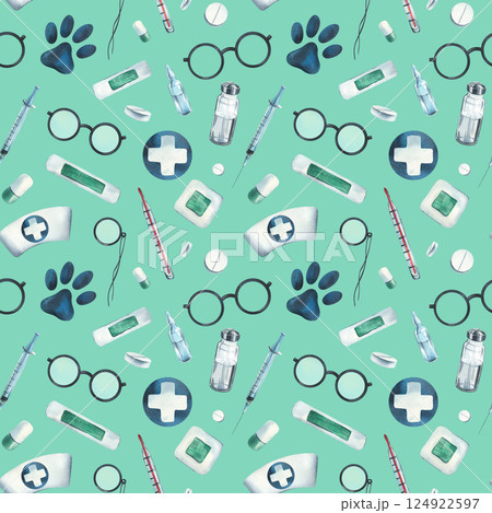 Veterinary medical instruments, medicines, blue cross. Watercolor illustration, hand drawn. Seamless pattern for wallpaper, packaging, fabric, clothes on a turquoise background.