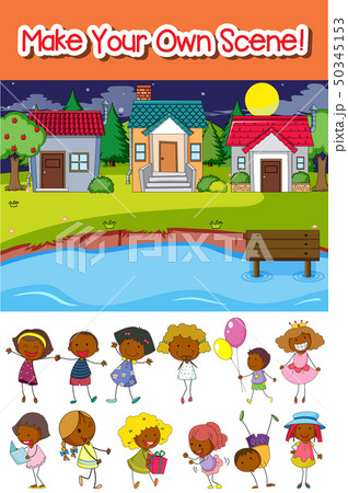Outdoor scene set with many kids doodle cartoon character