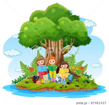 Children reading books in island