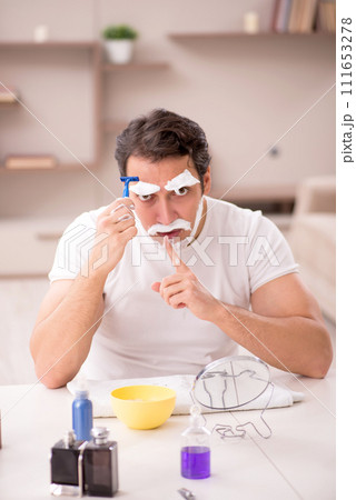 Young man shaving face at home