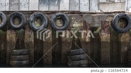 Mooring wall with rubber bumpers made of old used car tyres. Closeup
