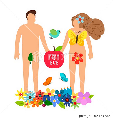 Adam and eve. Bible genesis vector illustration with naked woman, man, flowers and apple