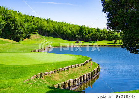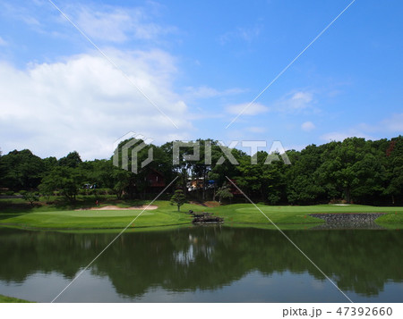 青空のゴルフ場・池越えグリーンのコースの眺め(千葉県木更津市)
