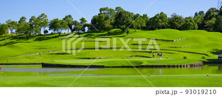 青空のゴルフ場・池越えグリーンのコースの眺めのパノラマ(千葉県木更津市)