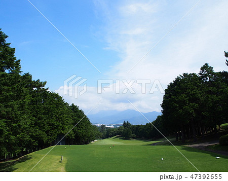青空のゴルフ場・ティーグラウンドからのロングコースの眺め(千葉県富津市)