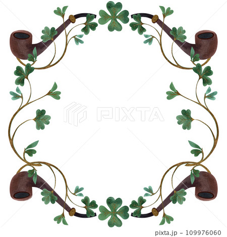 Frame of shamrock clover sprigs with leprechaun smoking pipes. Decoration for St. Patrick's Day. Isolated watercolor illustration on white background. Clipart.