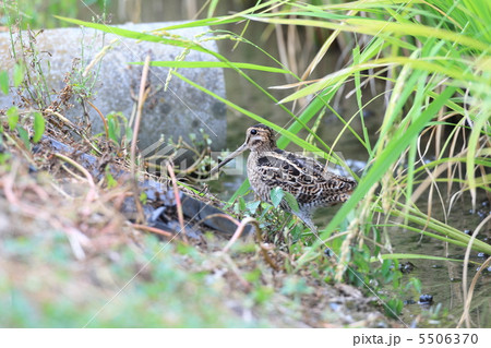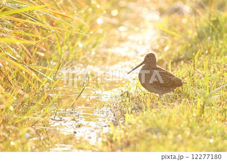 生き物 野鳥 タシギ、体長は二十七センチほど。長い嘴を泥に突き刺してミミズや昆虫を食べます