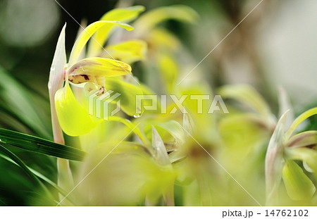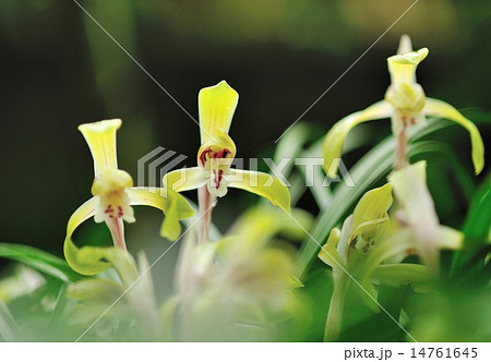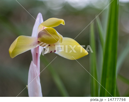 自然 植物 シュンラン、春に咲く花。花茎にベールの様な膜、横向きの清楚な花