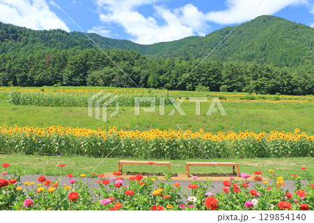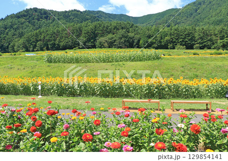 国営アルプスあづみの公園のヒマワリと百日草