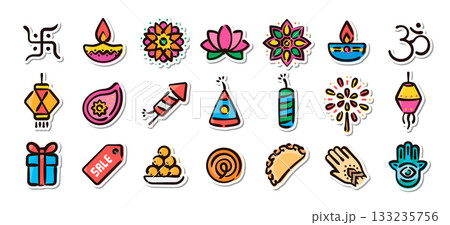 ディワリの手描きイラストステッカーセット イベントや装飾デザインのベクター素材