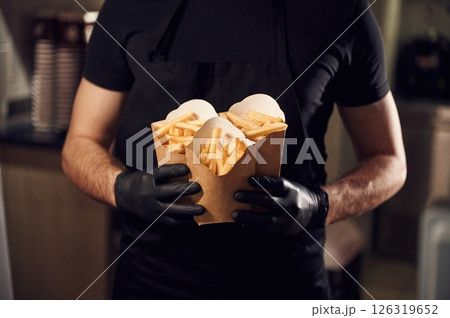 Man is standing and holding French fries that is in the paper eco boxes