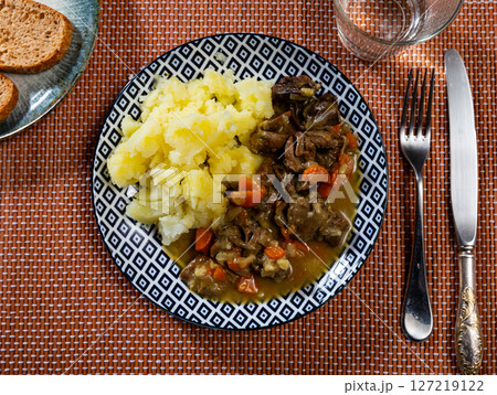 Beef served with potatoes on platter