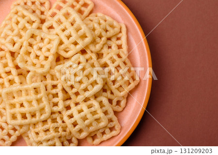 Lattice or wafer potato chips, crispy yellow snacks, takeaway food