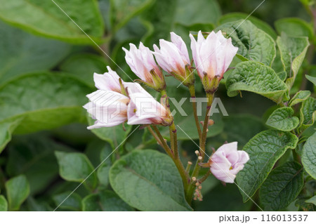 Cute pink bloom on the potato bushes in the garden.