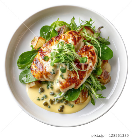 Pan Roasted Halibut Fillet with Caper Lemon Sauce and Braised Salsify on Baby Spinach and Potato Medley
