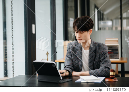 Judge gavel with scales of justice, Business and lawyer or counselor consulting and discussing contract papers with laptop and tablet at law firm