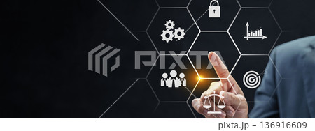 A businessman interacts with a digital interface showing icons for law, teamwork, processes, security, and growth. Concept of corporate strategy, management, and compliance on dark background