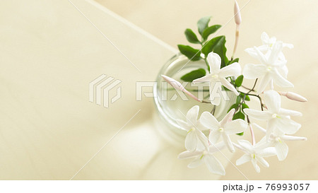ナチュラル背景 ガラス瓶の花 俯瞰 羽衣ジャスミン