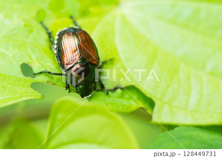 植物を食い荒らす害虫である小型のコガネムシ、マメコガネ