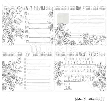 花束のイラスト入りバレットジャーナル シート4種類 リスト、週間予定表、メモ
