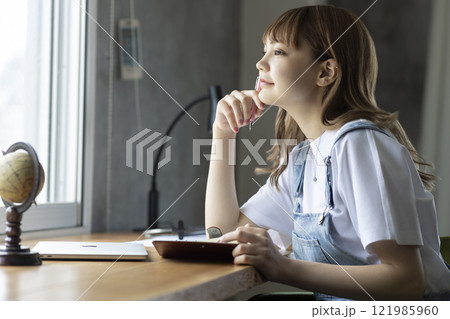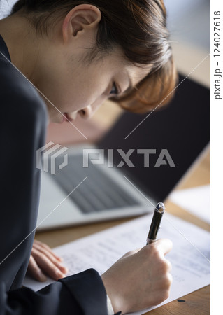 デスクで仕事や勉強をしている若くて綺麗なアジア人女性。