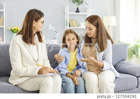 Understanding child psychologist and mother parent kind care, professional comforting school boy