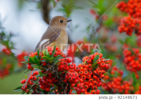 愛らしい仕草の冬鳥ジョウビタキと赤い実
