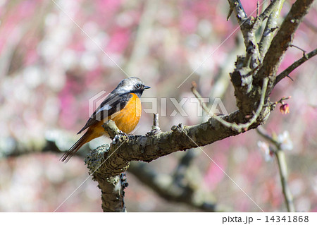 梅の枝にとまるツグミ科の渡り鳥ジョウビタキの雄