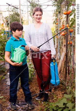 Little boy with watering pot and woman holding spraying apparatus near seedlings