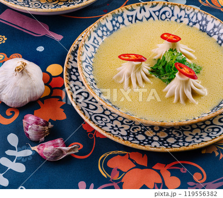 Traditional georgian dish khinkali in broth with herbs and spices on a decorated table