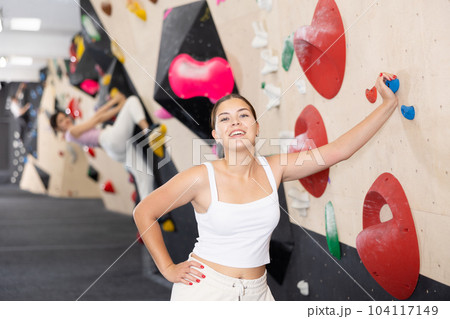Young smiling European girl coach stands at climbing wall and leans holding on to hook.
