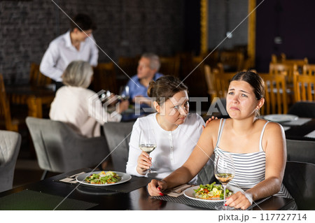 Sad upset young woman shares with female friend about difficult period of relations with boyfriend