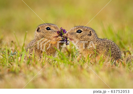 Two european ground squirrel touching flower on a meadow in summer nature