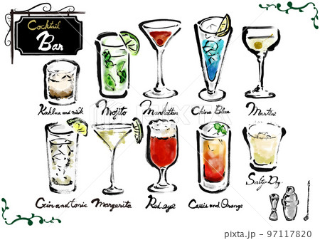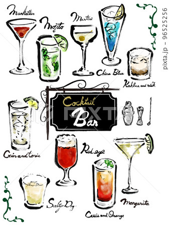 カクテルのセット 飲み物(お酒)の手描き水彩イラスト素材