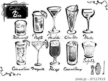 いろんなカクテルの手描きイラストセット 白黒,モノクロ,単色,
