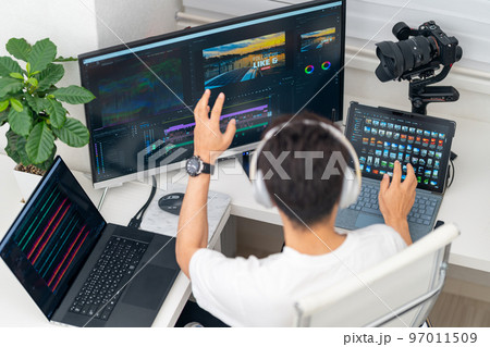 動画・映像クリエイター 男性 動画マーケティング 編集 宣伝活動 俯瞰 マルチディスプレイ ジンバル