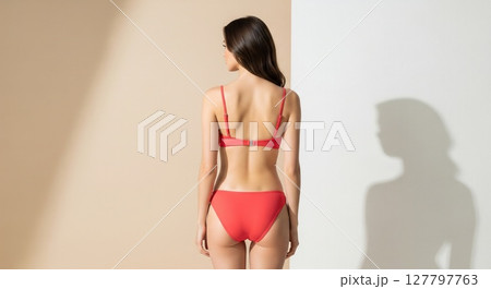 Elegant Red Bikini Fashion Model Poses Against Minimalist Studio Background