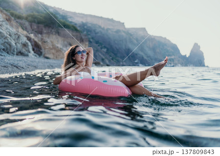 Woman, sea, beach. Relaxing woman floats on inflatable ring by rocky cliff beach at sunset.