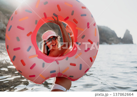 Woman, donut, water. Young woman relaxing on a pink donut float in the sea near rocky cliffs, enjoying a summer vacation.