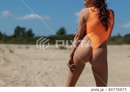 Sexy female in bright swimsuit on beach