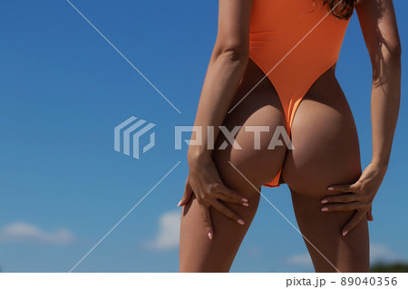 Crop woman in swimwear touching buttocks