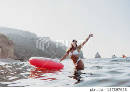 Woman, ocean, relaxation. Smiling woman floats on a pink donut ring enjoying summer vacation by rocky cliffs.