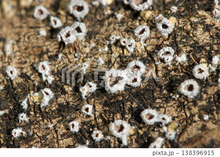 樹皮に広がる白い梳毛を纏った小さなスエヒロタケ幼菌コロニー(自然環境下菌・キノコ類マクロ撮影)