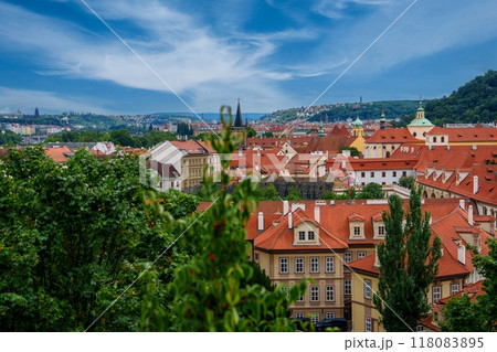 Picturesque cityscape of Prague with red-tiled roofs and lush trees under a blue sky